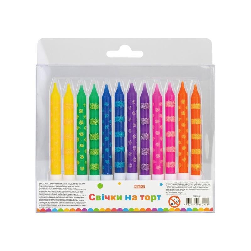 Набір свічок в торт 12шт з блискітками 8см з підставками №MX627085Р/Maxi/(12)(144). Святковий набір свічок для торта, чудовий вибір для створення особливої атмосфери.