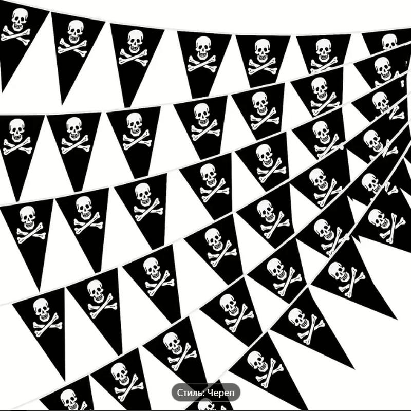 ## Большая гирлянда 10 метров на Пиратскую вечеринку с черепами Код 081038 Длинная 10-метровая гирлянда с крупными (20х30 см) флажками черного цвета с контрастно-белыми изображениями классического силуэта Весёлого Роджера – главного символа Пиратов – к вашим услугам! Гирлянду можно использовать как на открытом воздухе, так и для оформления интерьера локации, где будет организована Ваша тематическая Пиратская вечеринка Длина – 10 метров Размер флажка – 20х30 см