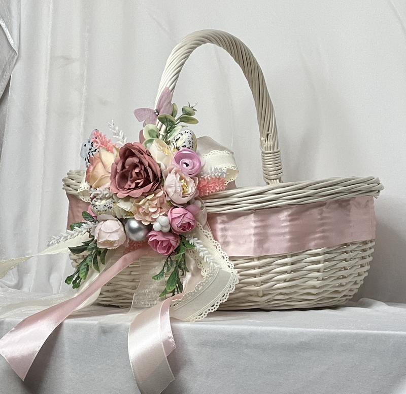 Кошик задекорований з лози, білий. Довжина 36см, ширина-28см, висота борту кошика 13х15см, висота ручки 29см.