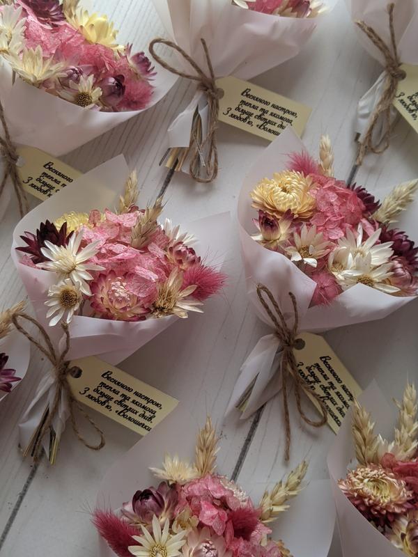 Мини букеты комплименты с новым интересным дизайном на ваши праздничные торжества. Композиции можно изменить и надписи на бирках также (например можно изменить цвет обертки и некоторых соцветий). Размеры букетов: 14х8см. Сохраняются очень долго, останутся в памяти, напоминая об этом незабываемом дне.