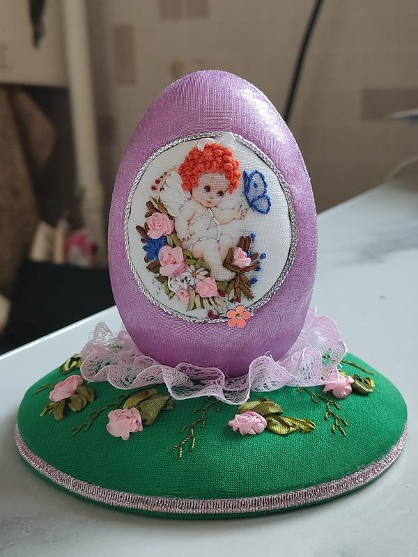 яйцо пасхальное небьющееся в основе пенопласт украшено вышивкой лентами, размер 10см в одном экземпляре