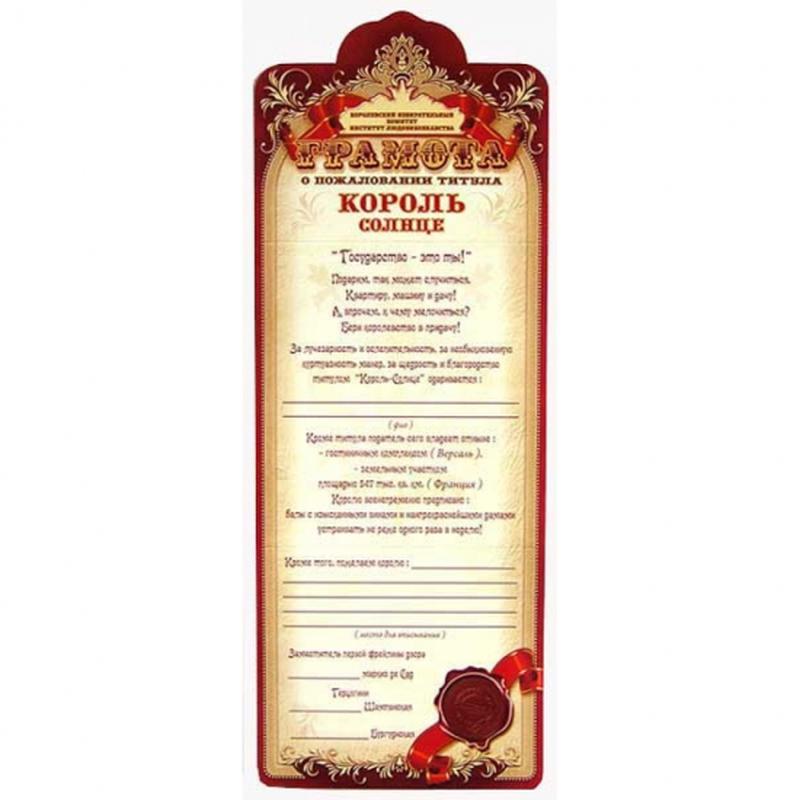 Грамота прикольная 20 видов Грамота прикольная 20 видовНужна оригинальная открытка? Вот - целая серия замечательных поздравительных грамот о присвоении виновнику торжества званий и титулов! Вот так запросто пусть станет царем, олигархом, человеком года. Есть и женские - княгиня, принцесса, королева красоты. Всего 20 наименований! Размеры,см. 32*12 Материал Картон