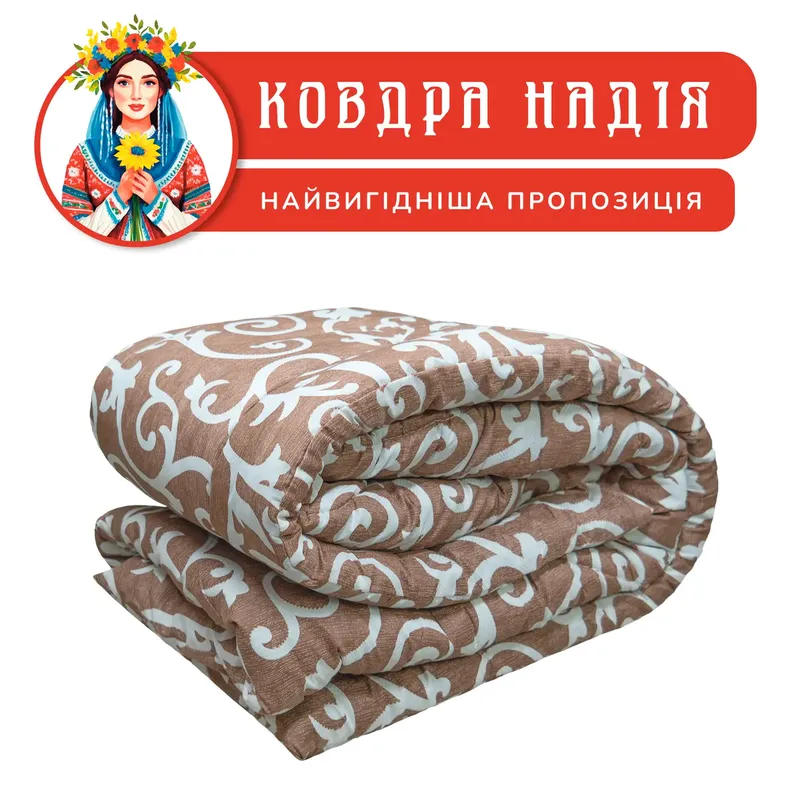 Одеяло "Надеяние" состоит из: Ткань поликоттон - состоит из хлопка и синтетического материала (полиэстера), сохраняющего тепло, а по прикосновению является мягким и упругим. Волокно холлофайбер 50 % - благодаря которому покрывало-одеяло становится более плотным. Одеяла с таким наполнением имеют высокий показатель теплоизоляции и гигиенические свойства, не впитывающие запахи, в них не заводятся паразиты. Восстановленное волокно 50% - это обрезки швейного производства, обработанные и расволокненные на специальном оборудовании, до состояния ваты. 140х205 - 560грн. 170х205 - 625грн. 190х205 - 680грн.