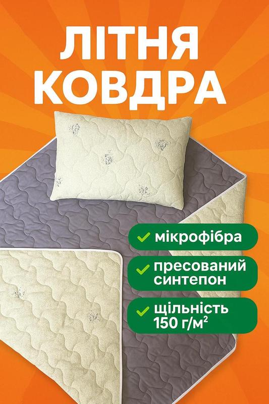 Лёгкое летнее одеяло из микрофибры обеспечит комфортный и прохладный сон в жаркую пору года. Наполнитель -- прессованный синтепон плотностью 150 г/м² -- отлично держит форму и не сбивается даже после многочисленных стирок. Изделие простёгано по всей поверхности, а по краям прошито прочной тесьмой, которая сохраняет форму одеяла і препятствует скручиванию углов. * * * 🛠 Основные характеристики: - 🧵 Верхняя ткань: микрофибра - 🌿 Наполнитель: прессованный синтепон - 📦 Плотность: 150 г/м² - 🔄 Стьёжка: по всей поверхности - 🪡 Обработка краёв: прочная лента - 🧺 Уход: можно стирать в машинке - 📐 Размеры: односпальные, полуторные, двуспальные * * * 📌 Преимущества: - Идеальна для летнего сезона - Долговечный наполнитель, устойчивый к стирке - Мягкая, приятная на ощупь микрофибра - Крепкая окантовка сохраняет форму и не даёт скручиваться