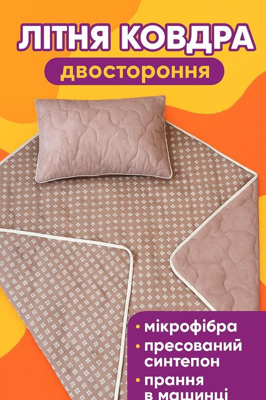 Двустороннее стёганое одеяло из микрофибры -- это лёгкое и практичное решение для сна в жаркое время года. Одна сторона -- с однотонным рельєфом, другая -- с геометрическим узором. Современный внешний вид + комфорт. Внутри -- прессованный синтепон, не сбивается при стирке и сохраняет структуру. Оптимальная плотность 150 г/м² делает одеяло легким и дышащим. * * * 🛠 Основные характеристики: - 🧵 Материал верха: микрофибра - 🌿 Наполнитель: прессованный синтепон - 📦 Плотность: 150 г/м² - 🔄 Тип: двустороннее -- узор + однотон - 🧺 Уход: машинная стирка - 📐 Размеры: односпальное, полуторное, двуспальное * * * 📌 Преимущества: - Отличная терморегуляция летом - Прочный край -- не сворачивается - Долговечное стёганое исполнение - Подходит для домашнего и гостиничного использования - Современный и универсальный дизайн
