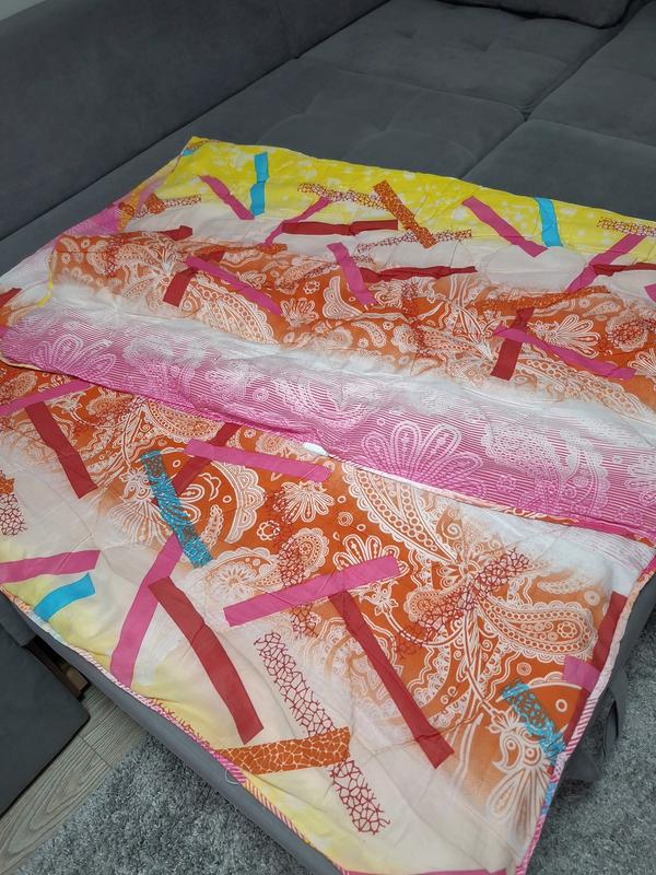 одеяло с ярким узором. 135/140×200см Изделие имеет градиентную расцветку: от белого/помаранчового в нижней части до желтого и розового в верхней. Узор включает абстрактные элементы, напоминающие пейсли и разноцветные полосы. Материал выглядит мягким и стеганым, что характерно для постельных принадлежностей. наполнитель: волокно антиалергенне чехол :поликотон в хорошем состоянии