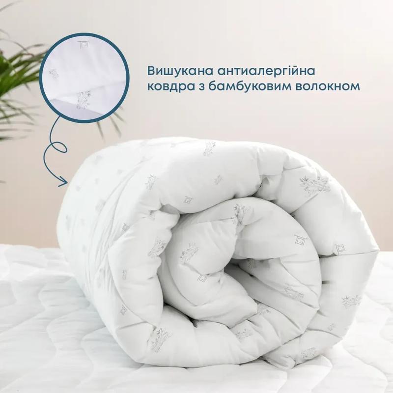 Вишукана антиалергенна ковдра з бамбуковим волокном. 7 причин полюбити цю ковдру: 1. не викликає алергії - тому користуватися можуть усі, 2. наповнювач з натуральним бамбуковим волокном для комфортного і міцного сну, 3. бамбукове волокно забезпечує відчуття свіжості вночі та є ідеальним для літа, 4. наповнювач рівномірно розподілений по всій ковдрі та не збивається - достатньо легко потрусити ковдру для відновлення об'єму, 5. м'яка ковдра повторює форму тіла і чудово зігріває, 6. простота у догляді: можна прати в пральній машині та сушити в сушильній машині, 7. виготовляється в Україні з турботою про здоровий сон і дотриманням європейських стандартів якості. Зовнішня тканина – високотехнологічна мікрофібра Membrana. З внутрішнього боку ця тканина оброблена ультразвуковим коландером, що створює ефект мембрани. Особливість мембрани – пропускати всередину виробу трохи більше повітря, ніж випускати назовні. Так виникає повітряний ефект, який робить ковдри та подушки більш об'ємними, легкими, ніжними. Membrana – це тканина нового покоління, оксамитова, еластична, ніжна і дуже міцна. Всередині ковдри - бамбукове волокно, яке має ефект свіжості та легкої прохолоди влітку. Ковдри з колекції Nature від ТЕП – це сила природного відновлення для здорового комфортного сну.