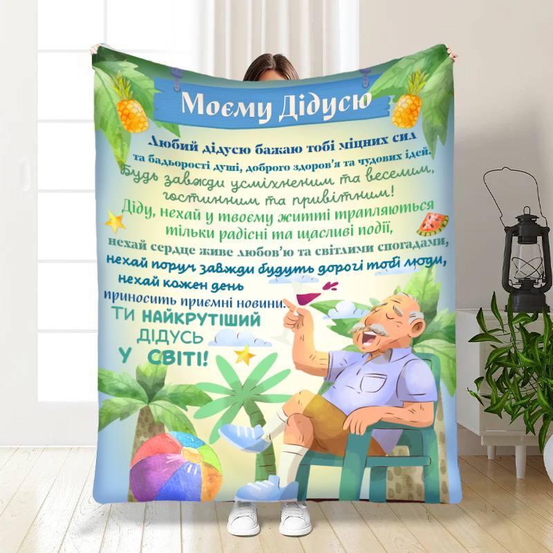 Персонализированный плед 3D Мой лучший дедушка качественное покрывало с рисунком 160х200 Персонализированный плед 3D Мой лучший дедушка качественное покрывало с рисунком 160х200 Материал: плюшевый велюр; плотность 260г Рисунок наносится способом сублимации на белое основание. Все красители фирменные Epson четкое изображение, не смывается. - Загадочная мягкость и непревзойденный комфорт – вот что вы найдете в наших плюшевых одеялах с разнообразными принтами. - Пледы изготовлены из высококачественного материала, который нежно гладит вашу кожу и обеспечивает незабываемое прикосновение. - Каждый плед имеет уникальный принт, что придает эстетический шарм вашему интерьеру и выражает вашу индивидуальность. Мы используем только качественную печать. Преимущества качественной печати на плюшевом одеяле несомненны. Вот некоторые из них: 1 Реалистичность: Изысканность деталей и воспроизведение цветов делают изображения на одеяле чрезвычайно реалистичными. 2 Текстурность: Плюшевая ткань придает изображению дополнительную глубину и текстурность. 3 Долговечность: Высококачественная печать на плюшевом одеяле обеспечивает его долговечность и стойкость к стирке. Вы можете наслаждаться качеством изображения в течение длительного времени без потерь. 4 Эстетика и индивидуальность: Благодаря качественной печати на плюшевом одеяле, вы можете создать уникальный декор для вашего пространства.