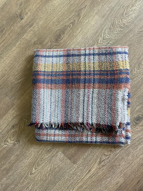 Чистошерстянной клетчатый плед пр-ва Британии!!! Расцветка в спокойной традиционной сине-голубой гамме с коралловыми и желтыми полосками! Размер - 115*155 см Из нюансов - возле края слегка разрежены нити ( около 1 см) - видно только на просвет - последнее фото)