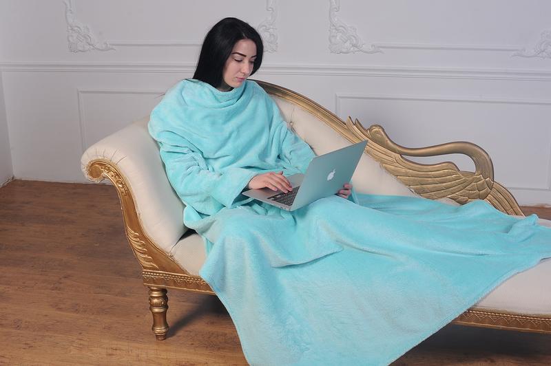Зимний теплый качественный красивый голубой ментоловый плед с рукавами карманом