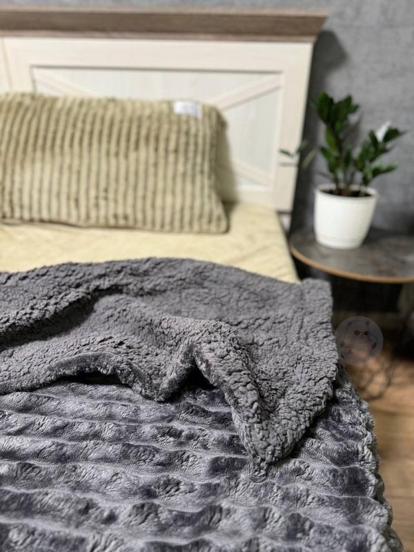 Легкий и нежный хлопковый плед в стиле шарпей – долговечная вещь, которая пригодится в качестве покрывала на кровать или в качестве декоративного украшения интерьера Теплый плед можно использовать вместо одеяла Размер: 200х220 см (+-2 см). Материал: плюш + искусственная овчина Состав: полиэстер