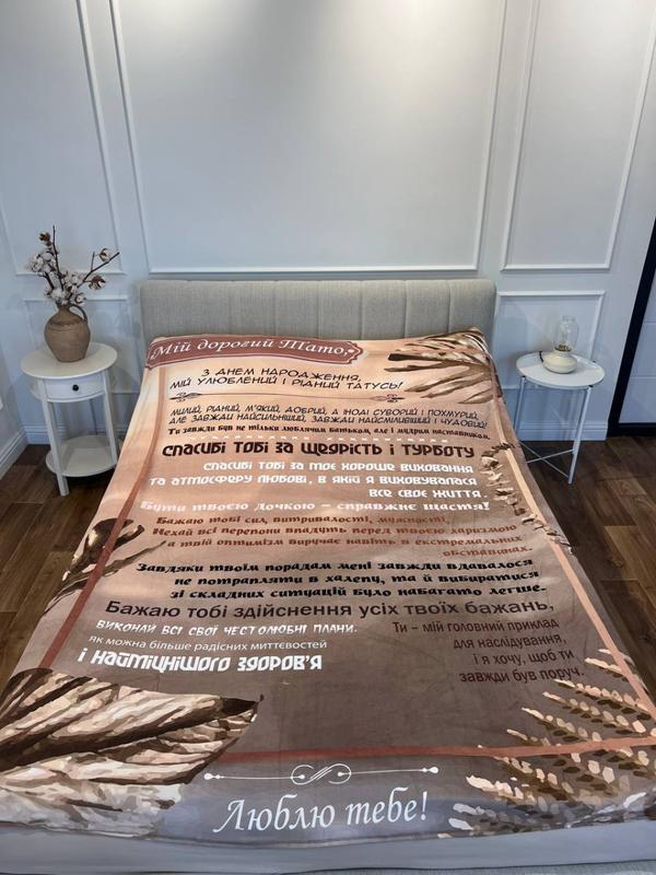 Плед 3D с пожеланиями Плед 3D с пожеланиями с яркой печатью станет отличным подарком близкому человеку, порадует взгляд и согреет прохладными вечерами. Теплый, мягкий и очень приятный на ощупь, яркий подарочный плед с индивидуальным изображением согреет не только тело, но и душу. Вы можете изменить текст пожеланий и фото на свои. Макет будет согласованный с Вами перед отправкой. Возможности: - Выбрать дизайн - Добавить фотографии - Написать собственное пожелание - Выбрать цвет пледа - Выбрать размер Персонализированное изготовление пледа со своим макетом возможно только по 100% предоплате. Характеристики: - Тип: плед - Материал: плюш - Состав ткани: 30% полиэфир, 40% акрил, 30% полиэстер - Использование: для спальни, гостиной, детской, пикника, авто - Цвет: разные цвета - Страна производителя: Украина ##