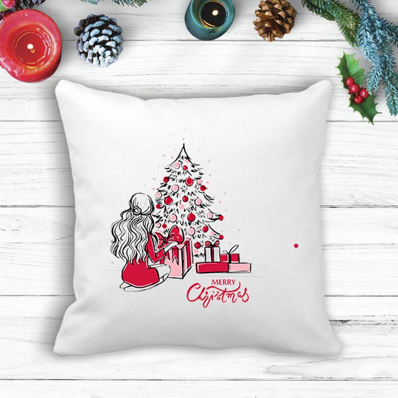 Подушка с новогодним принтом Девушка у елки с подарками "Merry Cristmas"