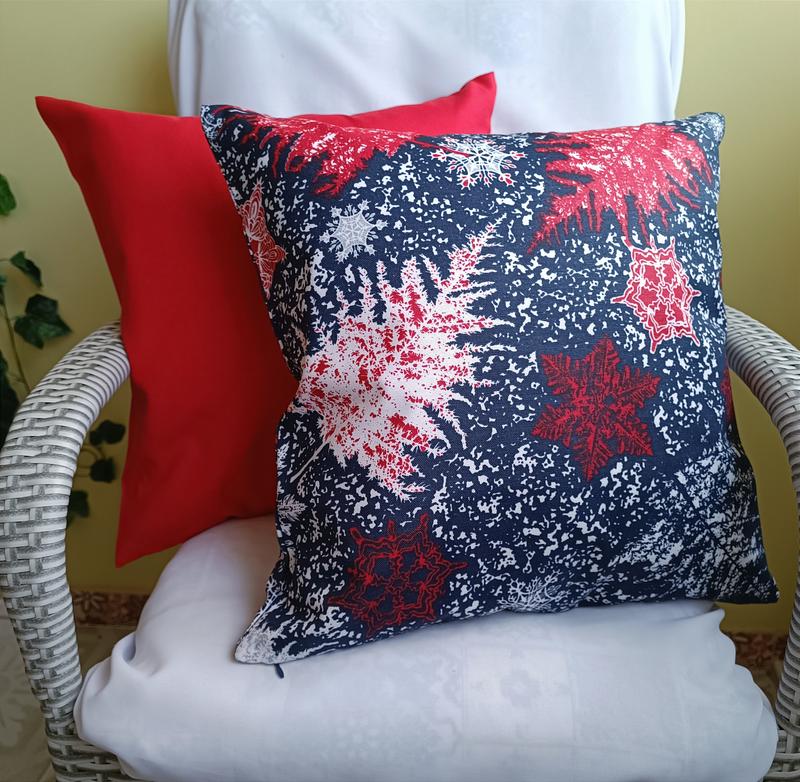 Набір декоративних новорічних наволочок 40*40 см червона однотона та синя з червоними сніжинками чудово поєднуються між собою по кольорах З щільної турецької декоративної тканини високої якості Призначення для декора інтер'єра, для садової мебелі на вулиці ,дома на дивані Ціна вказана за дві наволочки 40*40 см в наявності є декілька наборів! Наволочки на потаємній блискавці Склад тканини бавовна з поліестером Щільність 220г/ м2 ,щільна тканина! Доставка укрпоштою або новою поштою Оплата на картку Приватбанку