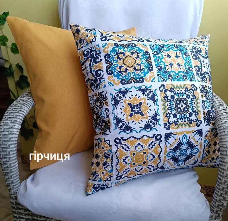 Набір декоративних наволочок 40*40 см бірюзово гірчична плитка та гірчична однотона гарно поєднуються між собою по кольорах Призначення : для декора інтер'єра,для садової мебелі на вулиці ,дома на дивані розмір 40*40 см ціна вказана за дві наволочки 40*40 см в наявності є декілька наборів! Щільна,декоративна тканина призначена для декора інтер'єра ! Склад тканини бавовна з поліестером Наволочки на потаємній блискавці! Щільність 220г/м2, щільна тканина! Доставка Укрпоштою або Новою поштою