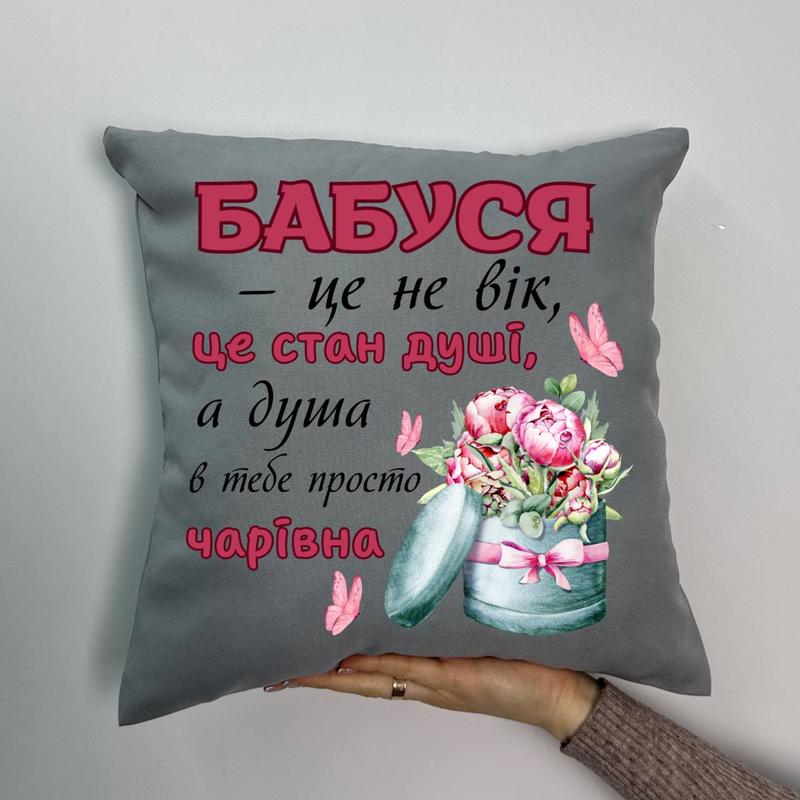 Подушка з принтом габардинова бабуся, сіра 35х35 (840)