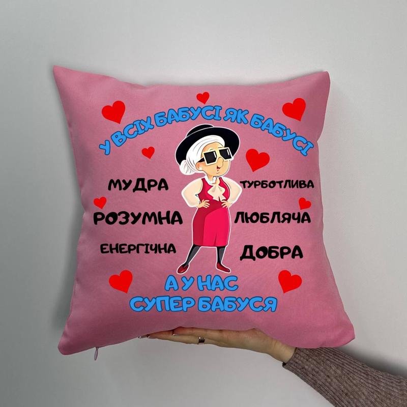 Подушка с принтом габардиновая у всех бабушки как бабушки а у нас супер бабушка, розовая 3...