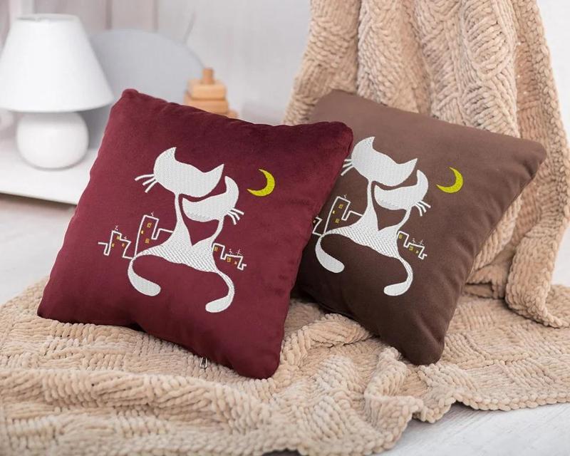 Декоративная подушка на диван для влюбленных с принтом «коты под луной» флок бордовый