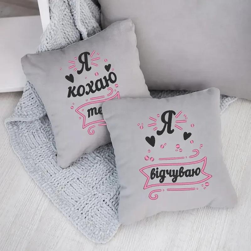 Набір подушок для закоханих 2шт. з 28 * 28см .«я кохаю тебе - я відчуваю» флок серый