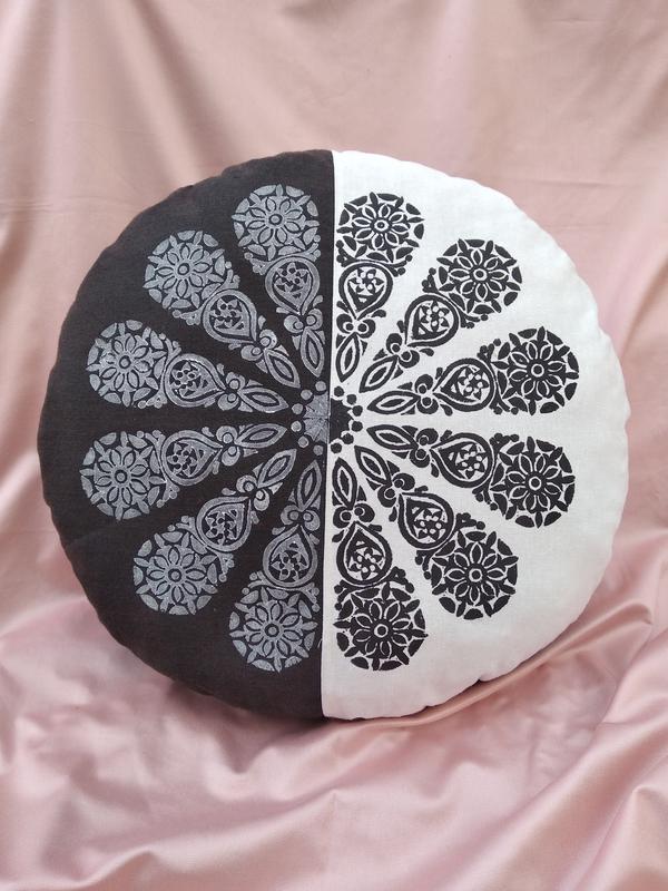 Подушка ручної роботи, розписана фарбами для тканини за допомогою техніки вибійка. розмір 40×40 в наявності 3шт.