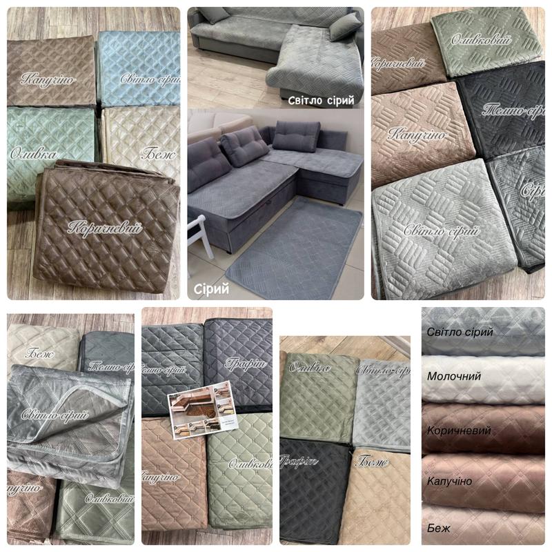 Хіт продажу!!!🔥🔥🔥 Дивандеки 3 в 1 Дивандеки – це комплект на диван та крісла. ✅ Набір накидок складається з 3-х виробів: 90 х 160 см - 2 шт 90 х 210 см - 1 шт ✅ Колір: світлий беж ✅ Матеріал: велюр, поліестер. 💰Ціна: ✔1-3 фото та 8-10 фото - 1460 грн ✔4-7 фото - 1400 грн Виворітна сторона прогумована не ковзає. ❣Можна використовувати як: 1) Комплект покривал для дивана та двох крісел. 2) Набір накидок для дивана, крісла та ще м'який килимок. 3) Комплект дивандек для кутового дивана та крісла. Накидки на диван мають протиковзання покриття зі зворотного боку, що дозволяє їх використовувати як покривала на шкіряний диван.👍 ❣Які завдання вирішує чохол на диван: 1. Захист поверхні дивана від пилу, легких механічних ушкоджень. 2. Камуфляж зіпсованого зовнішнього вигляду дивану. 3. Швидкий та недорогий спосіб оновити інтер'єр кімнати. 4. Спрощує та полегшує догляд за м'якими меблями. 5. Служить тимчасовою зміною на етапі чищення основного чохла. Чохол на диван просто необхідний у будинку, де є маленькі дітки чи домашні тварини. Аксесуар дуже простий у використанні, його навіть не потрібно гладити: практично всі виробники використовують для чохлів тканини, що не мнуться. Ці чохли універсальні, тобто. вони підходять до більшості моделей диванів та крісел. ❣Дивандек універсальний чудово підходить для тримісного дивана. 1. Не викликає алергії. 2. Безпечний для людського здоров'я та екологічно чистий. 3. Їх основа прогумована, що не дозволяє зісковзувати з меблів. 4. Дивандеки приємні на дотик і мають геометричний об'ємний візерунок. 5. Догляд дуже простий: вони без проблем стираються у звичайній пральній машині (при пранні 30-40 градусів 600-800 об. хв.). Бажаєте замовити? Пишіть, ми завжди раді вам відповісти! 🤗