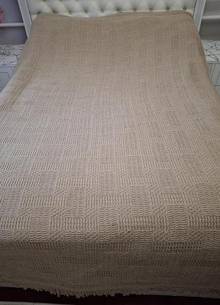 Покрывало плед бежевого цвета, теплое и мягкое, легкое в уходе, размер 220×240 см, с одной стороны края закруглены, было в использовании, но состояние очень хорошее.Соз 80% акрила.