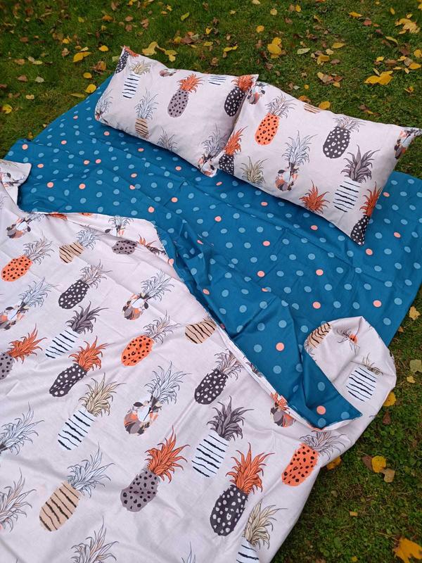 полутораспальный комплект постельного белья Ананасы Сатин 100% хлопок комплектация Наволочки 50х70см -2 шт-двусторонние Ананасы + оберошек Пододеяльник 145х215 см -1 шт-двусторонний Ананасы+горошек Простирадло 145х215 см -1 шт- горошок