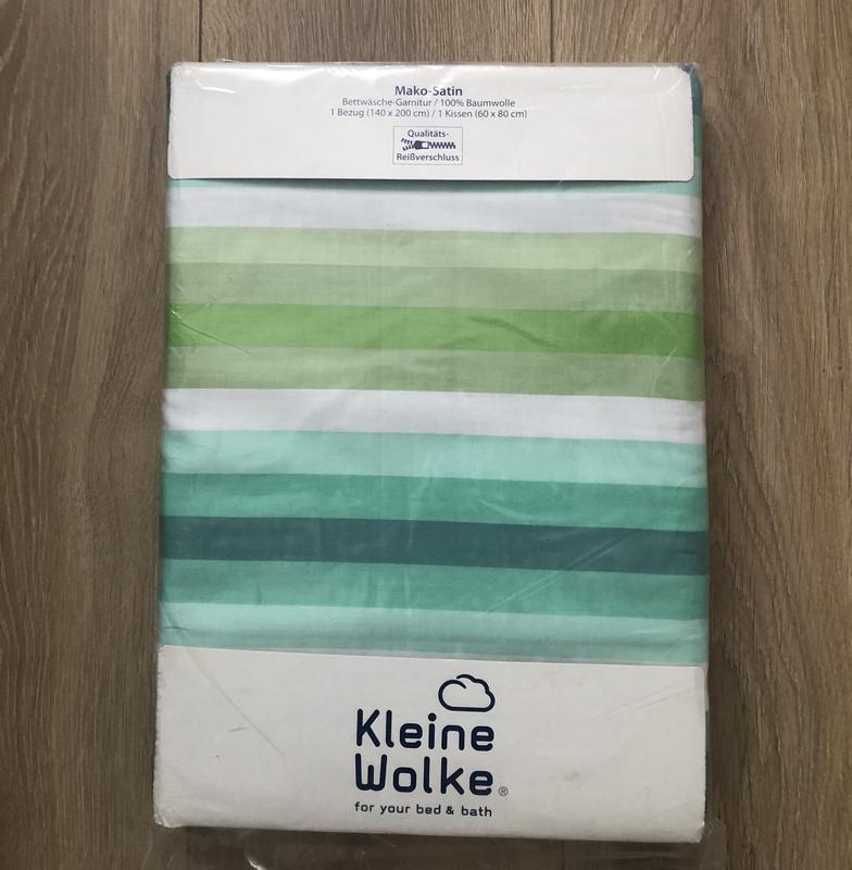 Kleine Wolke комплект постельного белья немецкого бренда, приобретался в Европе. В зеленых тонах в полоску. В комплект входит : пододеяльник размер 140* 200 и наволочка размер 60*80. 100 % бавовна ( сатин )
