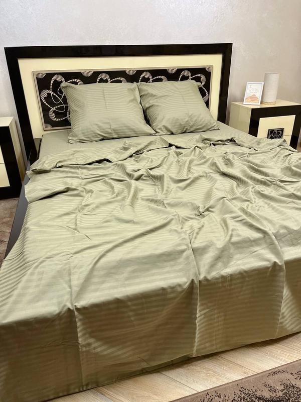 Постельное белье страйп сатин оливка двуспальное💚🥰, простынь на резинке страйп сатин, пр...