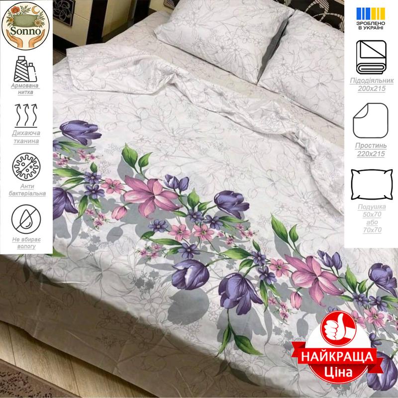 Постельное бельё евро "Флора Вайт" с 2 наволочками -- пакистанская бязь Элегантный комплект постельного белья с крупным цветочным орнаментом придаст спальне утончённости и уюта. 🌸 Принт с фиолетовыми тюльпанами и розовыми лилиями отлично смотрится на светлом фоне. 🧵 Ткань -- пакистанская бязь, прочная, не линяет и хорошо пропускает воздух. 🪡 Можно заказать простынь на резинке и замки на наволочках и пододеяльнике. Параметры комплекта: 📏 Пододеяльник -- 200x215 🛏 Простыня -- 220x215 💤 Наволочки -- 2 шт. 50x70 🧼 Рекомендованная стирка: 30-40°C 🧵 Состав ткани: 20% хлопок / 80% полиэстер 📦 Страна производства -- Украина