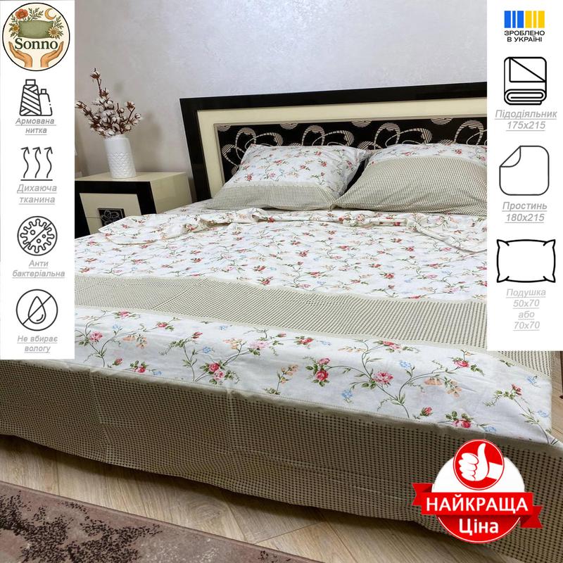 Постельное бельё двуспальное из пакистанской бязи в клетку с цветами, натуральный бежевый...