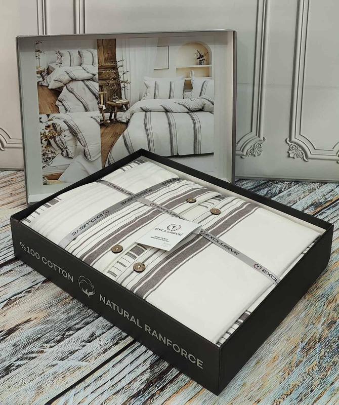 Постельное белье ранфорс с простыней на резинке евро размер Exclusive полоска кремовое Размер евро. Комплектация: Пододеяльник 200 на 220см Простыня на резинке 240 на 260 см Наволочки 2 шт. размер 50-70см Постельное белье изготовлено из 100% натурального хлопка, ткань высокого качества, приятная на ощупь. Простынь на резинке на матрац 160 на 200 см. Комплект упакован в красивую подарочную коробку. Постельное белье из ранфорса - это надежное качество, ткань которая будет служить вам годами.. ##
