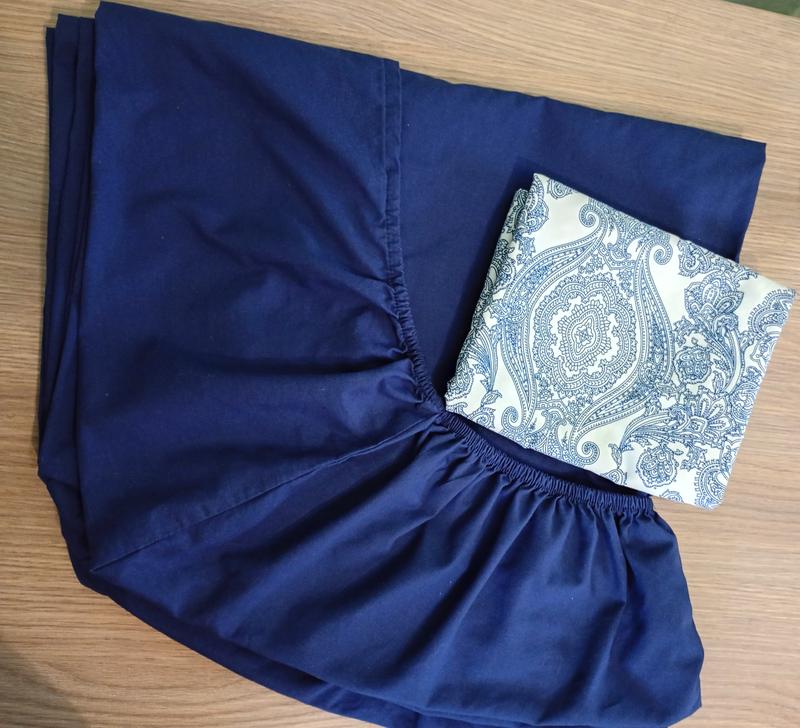 Комплект односпальный. Простынь (простынь) на резинке, резинка пришита с двух сторон по ширине. Цвет синий, фирмы TESCO. Cotton 50%. Размер 88*184*23. Наволочка с красивым принтом, сине-белая, хорошо гармонирует с простыней, фирма IKEA, размер 50*80, можно уменьшить под ваш размер подушки, (нескоточно)