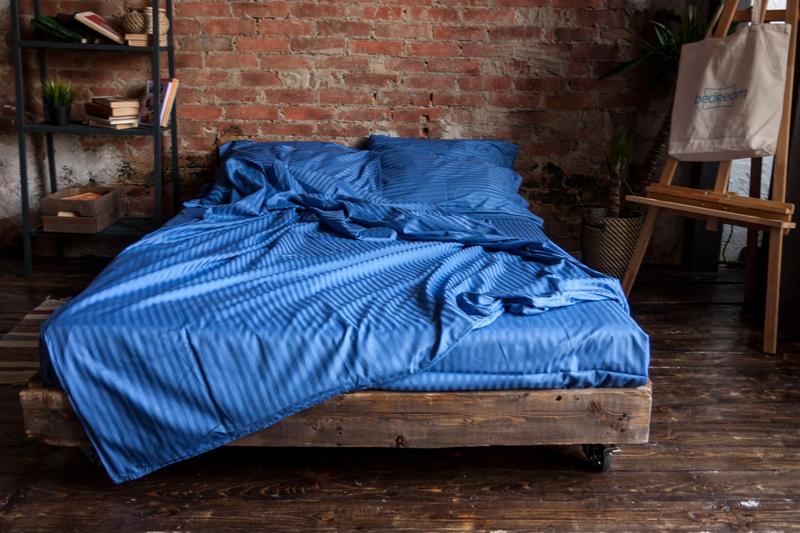 Комплект постельного белья из страйп сатина синего цвета, 💯 хоопок