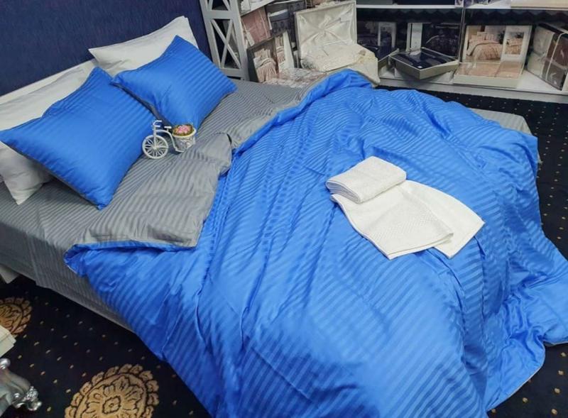 Постільна білизна / комплект постельного белья из страйп сатина, синий + серый, 100% хлоп...