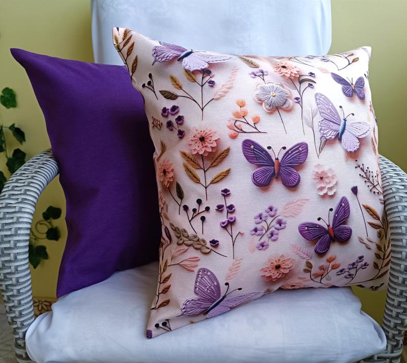 Набір декоративних наволочок 40*40 см бузкові метелики та фіолетова однотона чудово поєднуються між собою по кольорах Призначення : для декора інтер'єра,для садової мебелі на вулиці ,дома на дивані розмір 40*40 см ціна вказана за дві наволочки 40*40 см в наявності є декілька наборів! Щільна,декоративна тканина призначена для декора інтер'єра ! Склад тканини бавовна з поліестером Наволочки на потаємній блискавці! Щільність 220г/м2, щільна тканина! Доставка Укрпоштою або Новою поштою