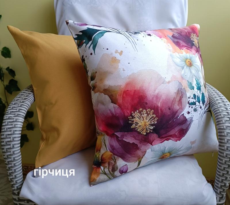 Набор декоративных наволочек 40*40 см большие акварельные цветы и горчичное однотона отлично сочетаются между собой Назначение: для декора интерьера, для садовой мебель на улице, дома на диване размер 40*40 см цена указана за две наволочки 40*40 см Плотная,декоративная ткань предназначена для декора интерьера! Состав ткани хлопок с полиэстером Наволочки на потайной молнии! Плотность 220г/м2, плотная ткань! Доставка Укр-почтой или Новой почтой