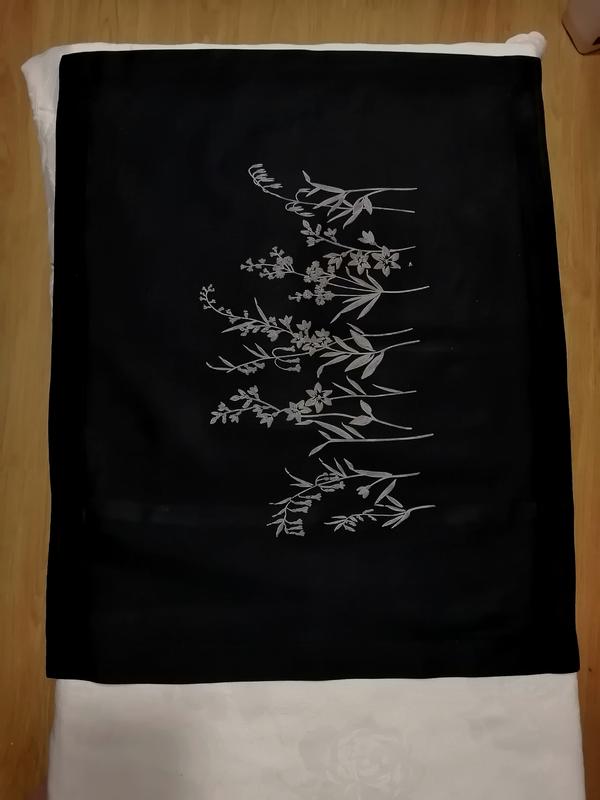 Качественный сатин. Черная с серым цветочным рисунком. Поверхность с легким блеском, мягкая, приятная. Размер без "ушек" 61*48