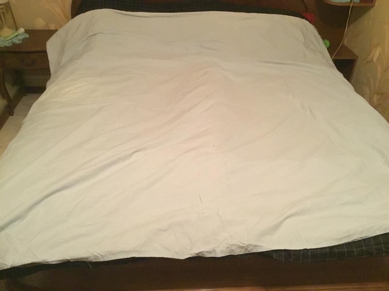 Пододеяльник 50% полиэстер, 50% коттон размер 198 на 195. Бу, но в хорошем состоянии. На последнем фото-пятнышко.