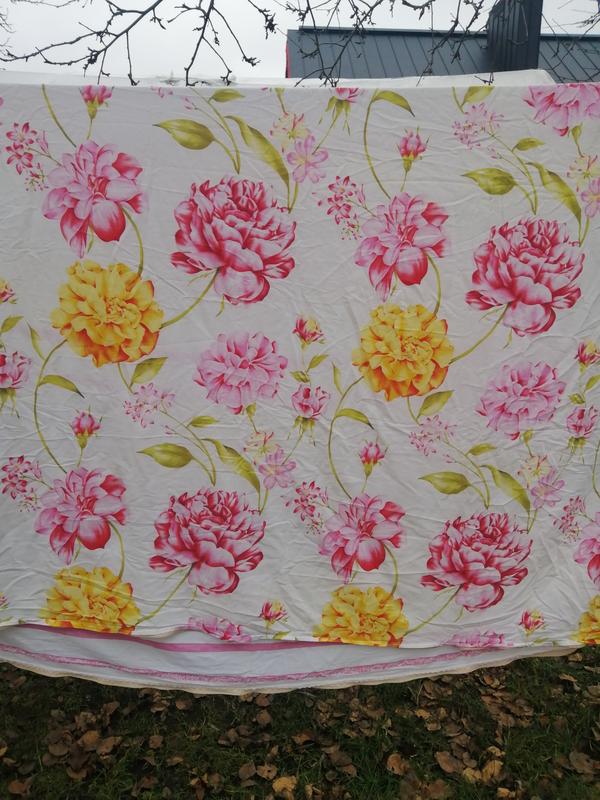 Размер 190 с на 210 см. С одной стороны шикарные цветы из другой полоски. На молнии. Состав ткани хлопок. Этикетка не нашла поэтомуmon хлопка от 50 до 100 %. Ткань приятная к телу.