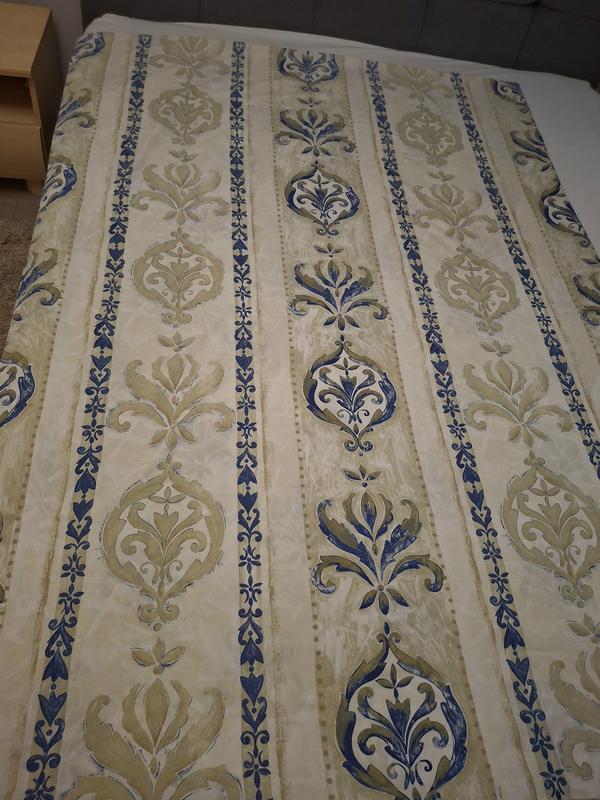 пододеяльник в стиле дамас Tarrington House AMBIENTE размер 130×190см 100%бавовна застежка на пуговицы белье имеет бежевый фон с контрастным синим и бежево-зеленым орнаментом, напоминающим узоры дамас или пейсли (турецкий огурец). Цветовая гамма: Основные цвета — различные оттенки бежевого, кремового и глубокого синего. Такое сочетание создает спокойную и расслабляющую атмосферу в спальне. Рисунок: Принт состоит из сложных цветочных узоров и вензелов, расположенных как на однотонном фоне (мабуть, наволочка/простынь), так и в виде полос на пододеяльник. без нюансов