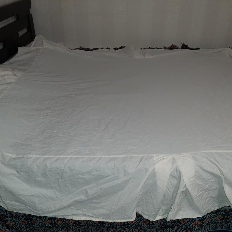 Матеріал 50% бавовна, 50% полиєстер, гарна якість, це співвідношення дає змогу більш довже користуватися білизною ніж 100% бавовна, бо сама бавовна швидко кшлатає, в усіх європейських брендів таке склад постільної білизни в основному. Полієстера зовсім не чутно бо це якісний продукт перевірений дермо контролем. Гарно запаковано. Колір молочний