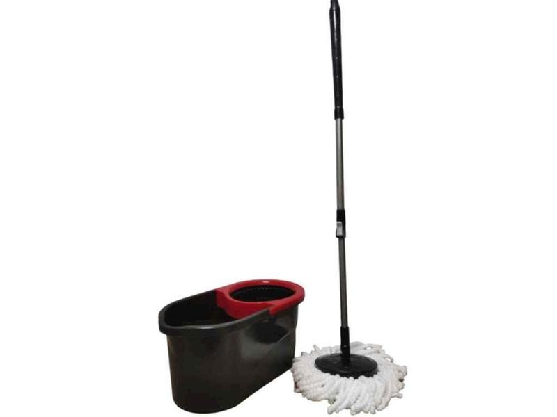 Набір для вологого прибирання в упаковцi. Відро з системою віджимання швабри за типом центрифуги. Телескопічна ручка швабри обладнана механізмом обертання, що робить процес віджимання та полоскання насадки швабри повністю автоматичним.