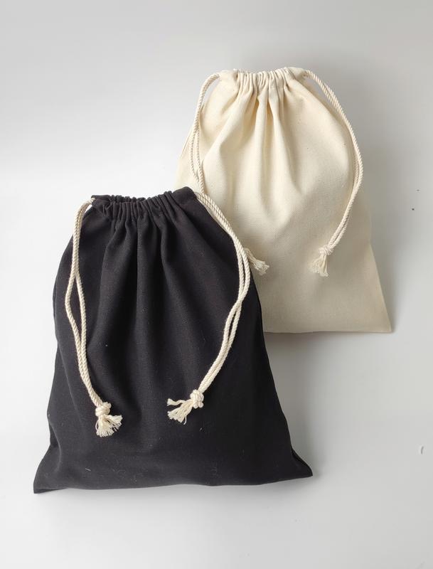 Мішечки зі щільної бавовняної тканини, колір бежевий, чорний Щільність тканини 220 гр/м2. Не просвічує, гарно триває форму. Спектр застосування великий: для пакування, для зберігання, для упаковки подарунків, тощо. Всі шви на торбинках є закритими, оброблені оверлочним швом. Розмір (+/-0,5) 30 см висота 25 см ширина