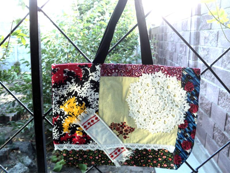 Хозяйственная сумка с вышивкой Техника: лосугольный шитье Работа: ручная Размер: 40х29 см Высота ручки: 22 см Работа выполнена в технике лоскутного шитья. Вышивка также выполнена вручную. Имеет внутренние и внешние карманы. Сумка в едином экземпляре.