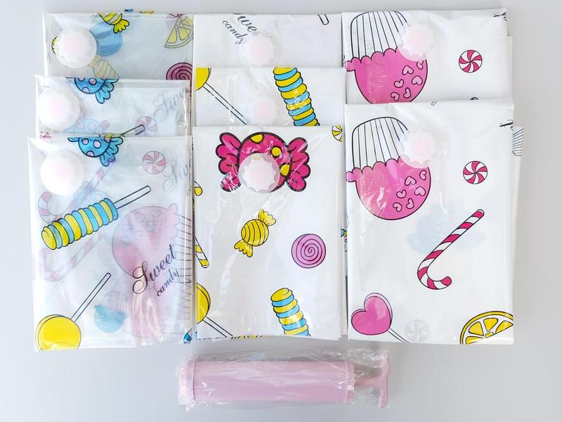 Набор вакуумных пакетов с рисунком из 8 штук ( 3 разных размера) и насосом для упаковки и...