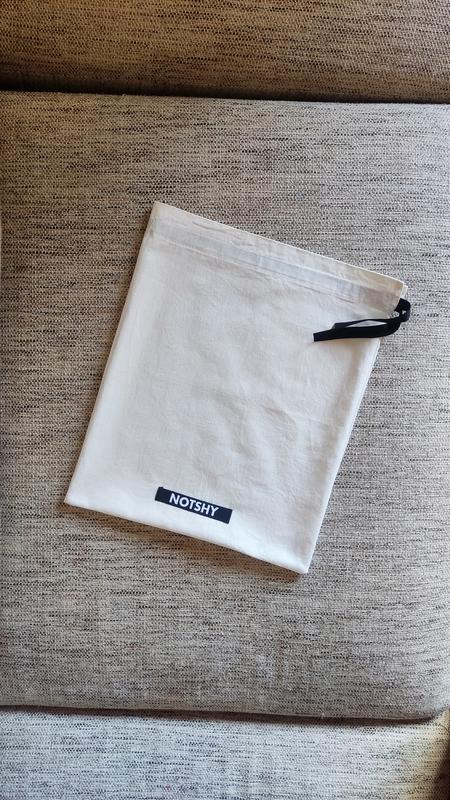 Пыльник Not Shy. Материал: хлопок натурального цвета, молочный. Сверху стягивается с одной стороны на чёрную ленту. С одной лицевой стороны пошита лента с наименованием бренда. Состояние очень хорошее, без дыр и пятен. Размер. 35 см (по верху 34) * 42 (из них кулиска 4,2 см). Лента 1.5 см. В профиле есть еще другие пыльники, одежда, аксессуары.