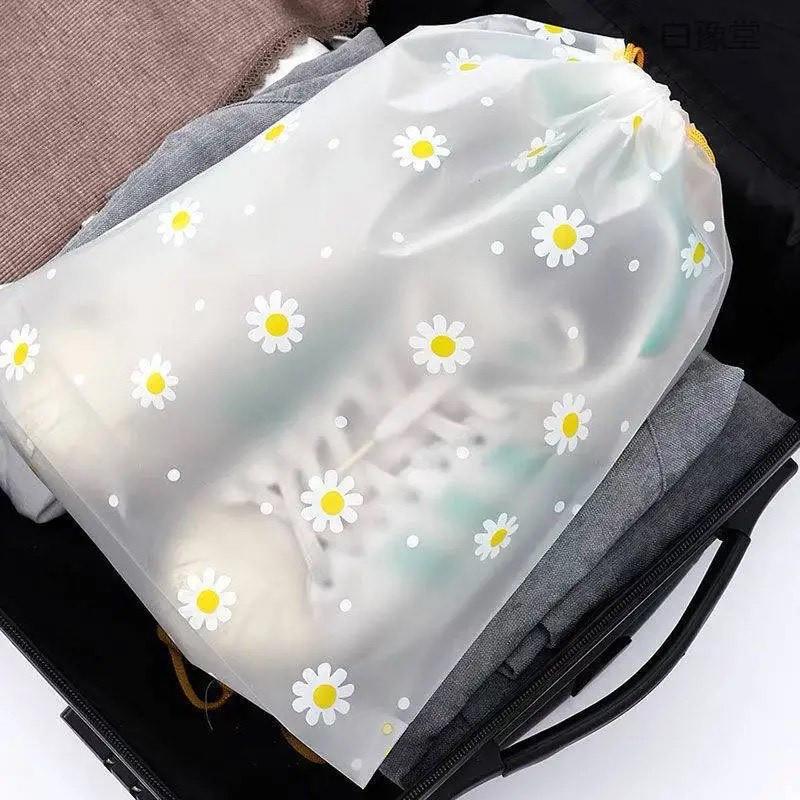 Удобный плотный мешок для хранения обуви, для сменной обуви в школу, на физкультуру, на гимнастику. Так же подойдет как многоразовый пакет для хранения обуви, туалетных принадлежностей и для путешествий. Характеристики пакета: - Цвет: прозрачный с ромашками - Размер: 30*20 см - Материал: пластик - затягивается на шнурке