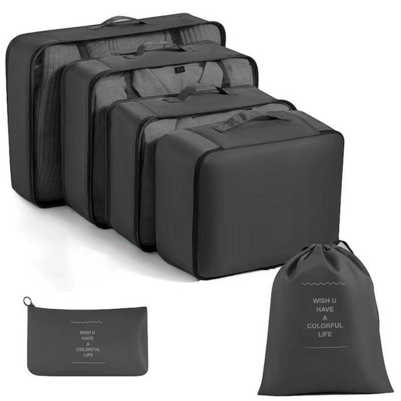 Удобные комплекты для путешествий позволят увеличить вместительность в чемодане, а также организуют порядок среди ваших личных вещей. Комплект легко складывается в один общий органайзер и не занимает много места в сложенном виде. Комплект состоит из 6 органайзеров: – органайзер для одежды размером 38*28*10 см. На дне органайзера расположены ремешки с карабинами для фиксации вещей (как в чемодане). Застегивается органайзер на молнию по периметру, крышка органайзера выполнена в виде капроновой сетки. – органайзер для одежды размером 30*24*9 см. На дне органайзера расположены ремешки с карабинами для фиксации вещей (как в чемодане). Застегивается органайзер на молнию по периметру, крышка органайзера выполнена в виде капроновой сетки. – органайзер для личных вещей размером 28*21*10 см. Застегивается органайзер на молнию по периметру, “крышка” органайзера выполнена в виде сетки. – органайзер для личных вещей или средств личной гигиены размером 28*20*10 см. Застегивается органайзер на молнию по периметру. На боку есть ручка для переноски. – органайзер-мешок размером 34.5*27 см, подходит для обуви, личных вещей, полотенец и др. Сверху затягивается лента. – органайзер – косметичка подходит для мелких предметов, размер 27*15 см, застегивается на молнию.