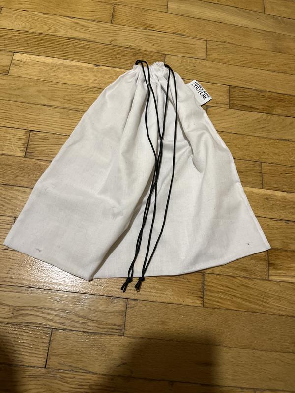 На зображенні видно білу сумку-мішок на зав'язках бренду Versace Jeans Couture та пару зелених капців з обличчям монстра, які схожі на капці з Грінчем. Деталі про товари Сумка: Це білий пильник або сумка-мішок на чорних зав'язках з логотипом "COUTURE." на чорній етикетці, яка використовується для зберігання або пакування одягу чи аксесуарів Versace Jeans Couture.